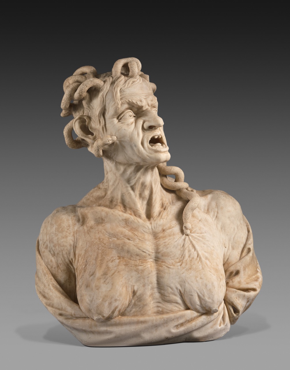 The exhibition also features three of Arcimboldo’s grotesque composite heads—faces formed from fruits, vegetables and other unexpected elements—embodying transformation in its most playful and unsettling form. A particular highlight is the life-size bronze Perseus with the Head of Medusa by the Dutch artist Hubert Gerhardt, made for the Duke of Bavaria. Shown for the first time alongside its model, the work is revealed as the prototype for Cellini’s far more famous sculpture of the same subject.