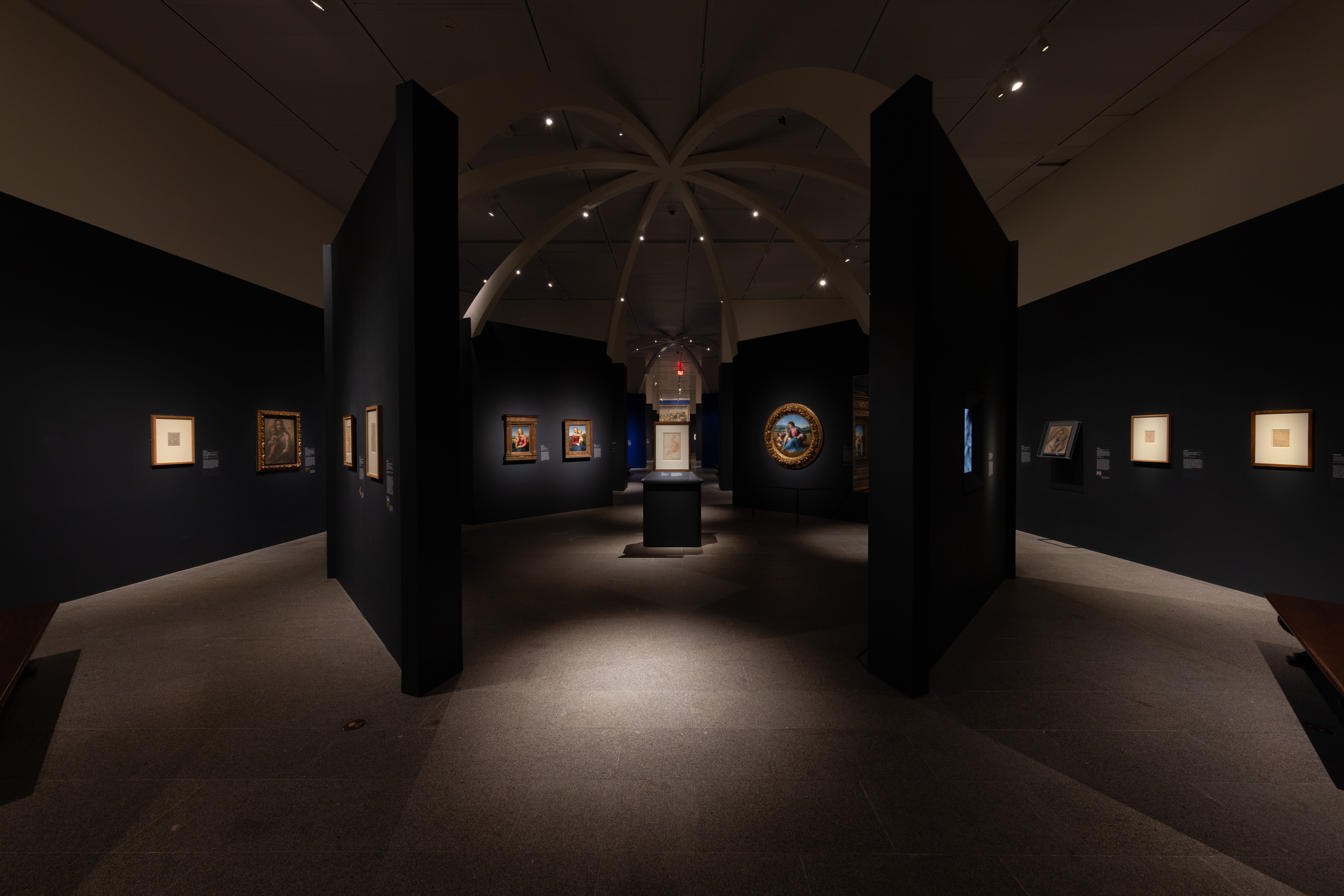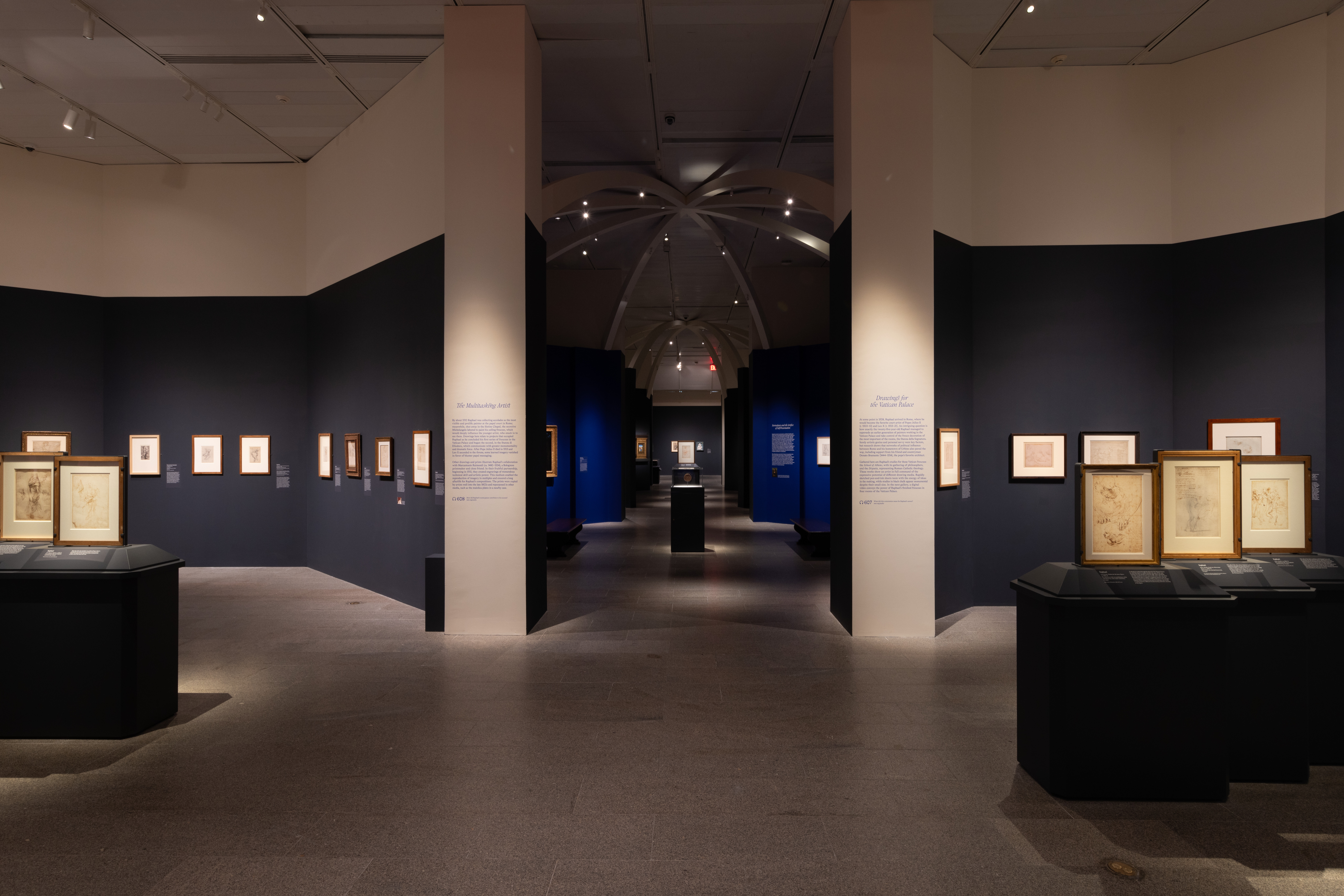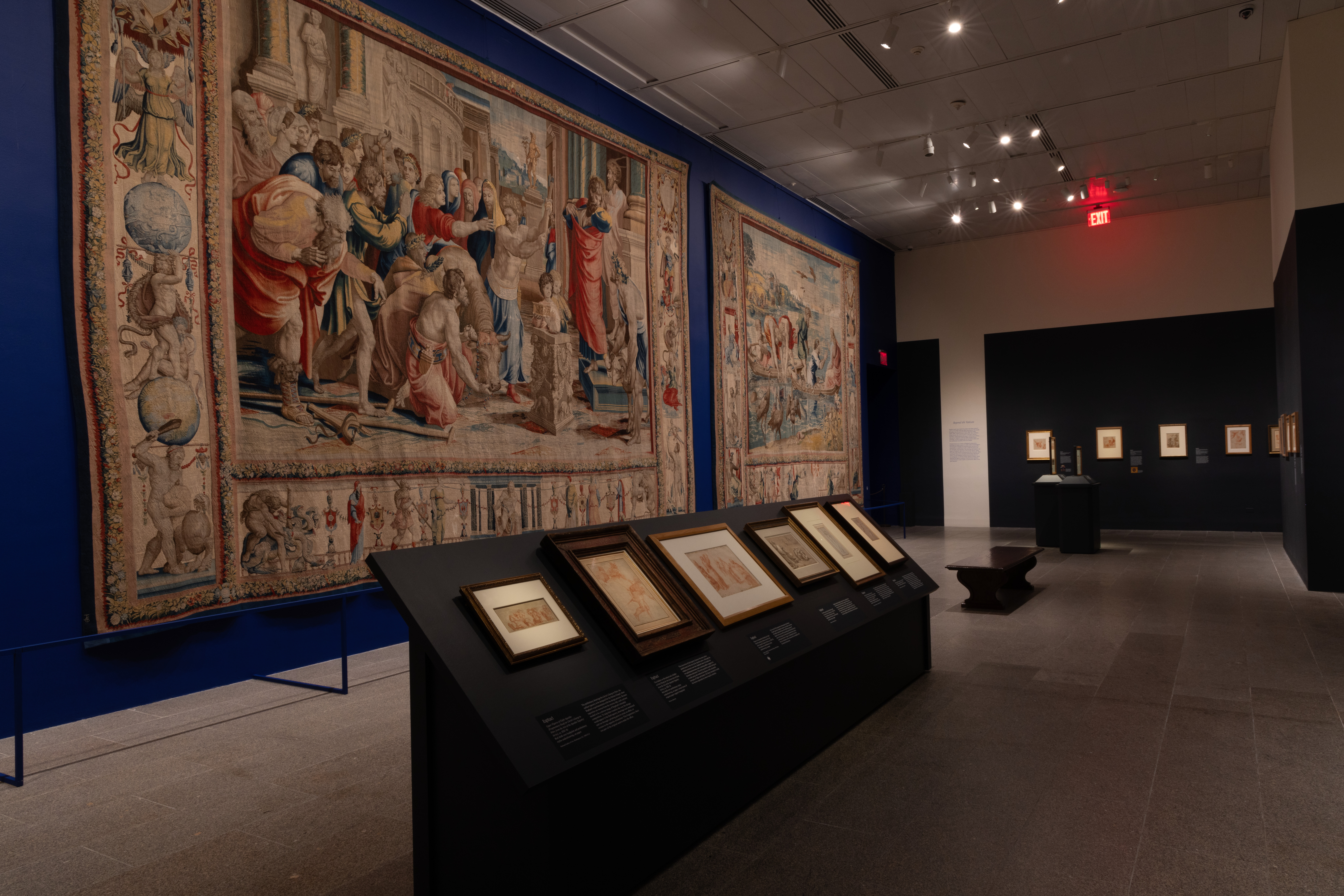 Next, the exhibition presents a digital video showing Raphael’s monumental fresco cycles in four rooms of the Vatican Palace. The display provides a sense of scale and context for the many related drawings in the exhibition. Between 1508 and 1524, the frescoes were painted by Raphael and his workshop in the nearly square rooms now known as the Stanza della Segnatura, Stanza di Eliodoro, and Stanza dell’Incendio and in the gargantuan oblong Sala di Costantino.